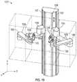 Thecarriage109 can be attached to thecolumn102 by a first joint113, which allows thecarriage109 to move relative to the column102 (e.g., such as up and down a first or vertical axis123). The first joint113 can provide the first degree of freedom (“Z-lift”) to theadjustable arm support105. Theadjustable arm support105 can include a second joint115, which provides the second degree of freedom (tilt) for theadjustable arm support105. Theadjustable arm support105 can include a third joint117, which can provide the third degree of freedom (“pivot up”) for theadjustable arm support105. An additional joint119 (shown inFIG. 13) can be provided that mechanically constrains the third joint117 to maintain an orientation of therail107 as therail connector111 is rotated about athird axis127. Theadjustable arm support105 can include a fourth joint121, which can provide a fourth degree of freedom (translation) for theadjustable arm support105 along afourth axis129.