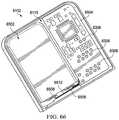 FIG. 65 illustrates a perspective view of a battery and a printed circuit board for an embodiment of an IPG;