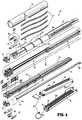 The distal end of the uppercradle drive bar42 includes acradle drive finger84 which is operatively associated with theupper cradle46. Thecradle drive finger84 translates theupper cradle46 between a retracted configuration (FIGS. 18 and 19) and an advanced configuration (FIGS. 21 and 22). As shown inFIG. 19, the distal end of thecradle drive finger84 is secured to an upper surface of theupper cradle46. As thecradle drive bar42 is advanced to advance thecradle drive finger84 thecam83 of thecradle46 is advanced through the arcedcam slot82. To accommodate the movement of thecradle46, a portion of thecradle drive finger84 is curved or flexible to bend as theupper cradle46 moves through a curved or arched path defined by the arcedcam slot82. When theupper cradle46 is advanced distally towards the advanced configuration, thecams83 of theupper cradle46 translate within thecam slots82 of theupper carriage45 to advance theneedles81 along an arced path. As theneedles81 are advanced in relation to theupper carriage45 which is held stationary as theupper cradle46 is advanced, the body of eachneedle81 tracks the distal end of theneedle81 such that the body of theneedle81 passes through a hole in tissue created by the distal end of theneedle81. When theneedles81 are retracted in response to retraction of thecradle drive bar42, the body of eachneedle81 passes back through the hole in the tissue such that the distal end of theneedle81 is withdrawn from the tissue. It will be understood, that thelower carriages47 andlower cradles48 are manipulated in a similar manner to theupper carriage45 and theupper cradle46 described above.