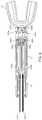 According to another embodiment of the invention, themeans403 of the connectingelement4 and themeans203 of thecleaning head2 ensure the sealed and stronger connection between the connectingelement4 and the cleaning head2 (i.e. the first connection). In one example, themeans403 comprise a keying arrangement and themeans203 comprise a locking arrangement configured to form the first connection. Further, the tapered shape of the keying arrangement can ensure an easy connection between the connectingelement4 and thecleaning head2. In another specific example, lugs on the keying arrangement can be used to ensure a good retention between the connectingelement4 and thecleaning head2. In another specific example, the cleaninghead2 is composed of cylindrical holes with dedicated diameters (for example, between 1 mm and 8 mm) to fit the keying imposed by the connectingelement4.