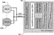 Generally, the one or more transducer assemblies coupled to the carrier substrate communicate with the host processor, device or system via a proprietary or standard communication protocol. Standard protocols include, for example, I2C, I2S, USB, UART and SPI among other known and future protocols. InFIG. 1, the microphone assemblies include a communication interface (e.g., contacts) that is electrically coupled to a shared buss of a Soundwireprotocol hardware interface152 associated with the host processor. The interface contacts between the host processor and the microphone assemblies are illustrated only schematically inFIG. 1. More generally however, the host communication interface could be compliant with some other communication protocol. The particular protocol may depend, in part, on the type of transducer assembly among other considerations. The number of nominally identical transducer assemblies connected to the shared data bus of the host communication interface may vary depending on the requirements of a particular application and the protocol implemented. For Soundwire protocol applications, up to 11 devices may concurrently share a common bus. Other proprietary or standard interface communication protocols may support more or less devices.