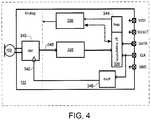 FIG. 4 is an electrical block diagram of a first exemplary embodiment of theprocessing circuit122 of a transducer assembly, which may correspond to themicrophone100ainFIG. 2 or to some other transducer assembly. InFIG. 4, an analog electrical signal generated by thetransducer element102 in response to sensing an acoustic input is input to theprocessing circuit122 via bonding wires and/or pads as discussed above. More generally, however, the transducer may sense ultrasonic energy, temperature, pressure, gas etc. and provide an appropriate electrical output to the processing circuit. The processing circuit may comprise a CMOS semiconductor die embodied in whole or in part as one or more ASICs or other circuits for performing the functions described herein. InFIG. 4, thesensor102 is an acoustic sensor and theprocessing circuit122 includes a Soundwire compliantcommunication protocol interface320. Other protocols may also be used for acoustic sensors. More generally, in other implementations the sensor could be a non-acoustic device and the communication interface could be compliant with some other communication protocol, such as I2C, I2S, USB, UART, SPI, among other known or future protocols. In some embodiments, as suggested, the transducer type may limit the interfaces available. For example, the Soundwire interface is suitable for acoustic signal interfaces.