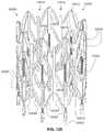 After being forcibly contracted, the lattice ofFIG. 138 can be further compressed within the delivery sheath of the delivery system, an orientation that is shown inFIG. 139. After delivery to the implantation site, the lattice is expanded for implementation, first naturally and then forcibly.FIGS. 140 to 142 show various expansion stages of the lattice in various perspective views withFIG. 142 showing the lattice expanded near a maximum expansion extent.