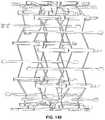 FIG. 134 is another exemplary embodiment of a self-expanding/forcibly-expanding lattice of animplantable stent assembly13400. In this embodiment, there are nine lattice segments but more or less is equally possible, for example, six segments. Instead of having the non-illustrated jack screws pass entirely through the material of the lattice as shown in previous embodiments, here, the jack struts of the lattice are elongated and the elongated portions are bent-over to form tabs13413,13414 for connecting to non-illustrated jack screw assemblies. The tabs13413,13414 are shown here as bent inwards, but they can also be bent to face outwards. To operate the jacks, various ones of each of the set of longitudinal tabs are threaded or smooth.