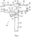 FIG. 9 illustrates a top, partially cut-away view of an aerosol dispenser comprising apparatus to pre-mix the sealant components prior to exiting the distal end of the dispenser and wherein a buffering solution is added just prior to spraying, according to an embodiment of the invention.