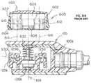 Adjuster magnets610 and612 are connected bymetal yoke608 and each has an axis of magnetization614 and616, respectively, which are substantially parallel in this construction as indicated with dashed lines. During adjustment of a valve unit such as valve unit100b, axes of magnetization614 and616 are oriented to be substantially parallel to axis of rotation618 through axle126bof rotor120b. In this construction, adjuster magnet610 has a south pole S that is oriented to facerotor magnet123band imaging reference ball129bwhile north pole N ofmagnet612 is oriented to facerotor magnet125b. Rotor120bis shown in a constrained condition inFIG. 31B, and is lifted to an unconstrained condition when the lower surface ofadjuster tool600 approaches within three cm (less than 1.25 inches) of the floor of a locator tool positioned on skin SK,FIG. 31A.