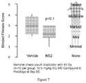 Example 4To measure the efficacy ofCompound 9 in treating allergic dermatitis, oxazolone (“OXL”) was applied (1.5%, 100 μL in acetone) to the shaved abdomens of mice. Seven days later, the thickness of the pinna of the OXL treated mice was determined. Then Compound 9 (100 mg/kg) or the vehicle (i.e., Captisol) was administered intraperitoneally to mice followed by topical application of OXL (1%, 20 μL) 30 min later to both the anterior and posterior portions of the right pinna. As a control, the left pinna received 20 μL of acetone (OXL excipient) to both the anterior and posterior portions. The thickness of the pinna of both ears was measured again 24 hours later. N=10 per group. The results are shown inFIG. 5B.