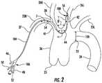 In addition, an extension of aproximal balloon38 and/ordistal balloon42 into the curvature of thecurved segment44 with an optional stretching of the balloons towards the pivot point of thesegment44 with creation, of a tension throughout the length of the catheter shaft covered byballoons38,42 would create an opportunity to achieve a desired angle of flexion (angle Alpha, a) of thesegment44 of the catheter to facilitate the entry of the ostia of the left carotid26L and/or left subclavian23L arteries with or without use of a guidewire by virtue of varying the degree of the proximal38 and/or distal42 balloon inflation and distention of the balloon tissue, thus exerting a desired degree of balloon stretching and leading to the appropriate angulation of respective areas of thesegment44 that may be partially or totally covered by theinflatable balloons38 and42.