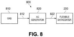 FIG. 8 shows aflexible datacenter200 powered byflare gas800 in accordance with one or more embodiments of the present invention.Flare gas800 is combustible gas produced as a product or by-product of petroleum refineries, chemical plants, natural gas processing plants, oil and gas drilling rigs, and oil and gas production facilities.Flare gas800 is typically burned off through a flare stack (not shown) or vented into the air. In one or more embodiments of the present invention, flaregas800 may be diverted812 to a gas-powered generator that produces three-phase gas-generatedAC voltage822. This power may be considered behind-the-meter and is not subject to transmission and distribution costs. As such, one or moreflexible datacenters200 may be powered by three-phase gas-generated AC voltage. Specifically, the three-phase behind-the-meter AC voltage used to powerflexible datacenter200 may be three-phase gas-generatedAC voltage822. Accordingly,flexible datacenter200 may reside behind-the-meter, avoid transmission and distribution costs, and may be dynamically powered when unutilized behind-the-meter power is available.