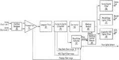 Pace pulse detector62 analyzes these over-range signals as well as the pace spike analysis and/or pace artifact analysis performed as described above and outputs a pace artifact detection signal and a pace spike detection signal based on the analyses. In one example,pace pulse detector62 generates and/or asserts the pace artifact detect signal when any of the over-range conditions are met or the amplitude, slew rate, and pulse width analysis indicates that the presences of a pacing artifact. Likewise,pace pulse detector62 generates and/or asserts the pace spike detect signal when any of the overrange conditions are met or the amplitude, slew rate, and pulse width analysis indicates that the presences of a pacing spike. The pace artifact analysis and the pace spike analysis may be capable of detecting pace artifacts and pace spikes that are not large enough to trigger the over-range conditions described above.Pace pulse detector62 outputs the pace artifact detect signal to blankingcontrol module64 and outputs the pace spike detect signal to controlmodule30.