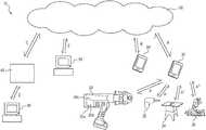 FIG. 8 schematically illustrates yet another embodiment of asmart tool system10A in accordance with the present subject matter. Thesmart tool system10A illustrated comprises one or moresmart tools20,22,24 and26; one or more electronicmobile devices30,30′,30″ and30′″; and a conventional cloud-based infrastructure50 (“thecloud50”) which includes a registration-and-control component40′ for providing communication between the one or more electronicmobile devices30,30′,30″ and30′″ and the one or moresmart tools20,22,24, and26. As an example of one such smart tool,FIG. 8 depicts a handheld battery-poweredtool20 having one ormore indicators20aand20b, andvisual indicia20c, and including (i) electronic data-storage provisions; (ii) electronic communication provisions; and (iii) electronic tool-lock provisions, where these smart tool provisions, as discussed above and as will be described further below, are applicable to smart tools, in general, in accordance with the present subject matter. Thesmart tool system10A illustrated byFIG. 8 comprises one or more electronic communication links F, F′, F″ and F′″, respectively, between eachsmart tool20,22,24 and26 and the registration-and-control component40′ of thecloud50. The illustrated nonlimiting examples of smart tools incorporating the present subject matter include ahandheld drill22 which can communicate with thecloud50 via at least one such link F′, atable saw24 which can communicate with thecloud50 via at least one such link F″, and a miter saw26 which can communicate with thecloud50 via at least one such link F′″. The illustratedsmart tools20,22,24 and26 as well as other smart tools within the scope of the present subject matter, include the following smart-tool provisions, namely: (i) electronic data-storage provisions; (ii) electronic communication provisions; and (iii) electronic tool-lock provisions. Furthermore, the electronic communication provisions include wireless and/or cellular communication provisions; and the tool-lock provisions include devices for locking or otherwise disabling a particular tool, automatically, after a tool operation parameter limit or other condition has occurred. Nonlimiting examples of tool operation parameter limits include number of cycles (e.g., no more than 10, 25, 50, 100, 500 cycles of operation; or no movement beyond 100 meters, 200 meters, or 300 meters from a specified location or job site; or no smart tool operational activity between specified times-of-day, such as, 9:00 am and 5:00 pm; and combinations of these limits). Additional nonlimiting examples of such smart tools include temperature-measurement devices such as thermal cameras, or visual-inspection devices such as drain inspection cameras, each of which include these smart-tool provisions: (i) electronic data-storage provisions; (ii) conventional electronic communication provisions; and (iii) conventional electronic tool-lock provisions. Thus, in thesmart tool system10A shown inFIG. 8, the illustratedsmart tools20,22,24 and26 can communicate by wireless connection or via cellular connection, directly with the registration-and-control component40′ of thecloud50 via communication links F, F′, F″ and F′″, respectively. In accordance with the present subject matter, the electronic mobile devices shown include asmartphone30, aPDA30′, atablet computer30″ and alaptop computer30′″ any one of which can be configured to communicate by wireless connection or cellular connection, directly with the registration-and-control component40′ ofcloud50 via communication links G, G′, G″ and G′″, respectively. In addition, thesmart tool system10A depicted inFIG. 8 can include at least onedesktop computer65 electronically configured to electronically communicate via communication link L with the registration-and-control component40′ of the cloud-based architecture (“the cloud”)50 described above. Further, the present subject matter contemplates additional variations (not depicted), in which at least onedesktop computer65 could be configured electronically to communicate directly, using wireless or cellular connection, with at least one of thesmart tools20,22,24, and26.