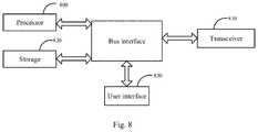 InFIG. 8, the bus interface may include any number of buses and bridges connected together. Specifically, a plurality of processors such as theprocessor800 and a plurality of storages such as thestorage820 are connected together. The bus interface may also cause any other circuits such as a peripheral circuit, a voltage regulator and a power management circuit to be connected together. The circuits are known in the art, and thus detailed description thereof are not further provided herein. The bus interface provides an interface. Thetransceiver810 may include a plurality of elements such as receivers, transmitters, and units for communicating with other devices through a transmission medium. Directed to different terminal, theuser interface830 may also be an interface capable of being connected to external devices including, but not limited to, keypads, displays, speakers, microphones, joysticks, or the like.