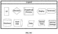 FIG. 33C is a legend for the items illustrated in the flow chart ofFIGS. 33A-33B, according to an aspect. As shown, various shapes are used to represent user interfaces, decisions, predefined processes, displays, terminators, databases, hard disks, data, stored data, and internal storage in the flow chart.