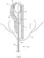 In embodiments, thelateral support58 may be attached to theshaft52 at any suitable location, such as at any distance from thedistal tip59. Variation in the location of the attachment point may create lateral support at different locations along theshaft52. Such variation may provide different locations of pressure application by theballoon56. Such variation may also provide different angles of tipping of the distal end of theshaft52. In embodiments, thesupport58 may be held to theshaft52 by features other than passing through a lumen in theshaft58. For example, thesupport58 may be mounted on the exterior of theprobe shaft52, passing beneath various straps or through various eyelets which hold thesupport58 near or against theshaft52. Likewise, thesupport58 may be slidably attached to theshaft52 at one or more points in addition to the attachment point. Such slidable attachment points may be achieved by passing thesupport58 through a short lumen in theshaft52 or beneath a strap or through an eyelet exterior to theshaft52. Thus, as thesupport58 is advanced, thesupport58 is able to bow or bend laterally outwardly around the attachment points, creating more than one lateral support.