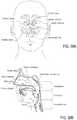 FIGS. 38A and 38B are frontal see-through and sagittal cross-section illustrations, respectively, of a human head, illustrating nasal and upper airway anatomy, including the superior turbinate, the middle turbinate, and the inferior turbinate.
