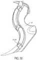 FIG. 59 shows a side, perspective view of theocclusion assembly700 ofFIG. 50 with thepiston arm742 in a fully retracted position, with certain elements removed as inFIG. 58 for clarity. In this example, the latchingpin726 is shown to be completely disengaged from theretention member718; and in the absence of an activating force on theactuator717 or a pressing force on thebutton716, thepiston arm742,carriage723 andspreader722 are free to retract under the force of a main spring745 (seeFIG. 60) biased against the extension ofpiston arm742. Thespreader722 then moves toward the occluding ends713,715 of the occludingarms710,711. In an embodiment, as shown inFIGS. 58 and 59, thebutton716 pivots about apivot732 to raise alever arm733 when thebutton716 is pressed. Thelever arm733 is pivotally connected to a connectingmember734 via aproximal pivot735. The connectingmember734 in turn is pivotally connected to thecarriage723 via adistal pivot736. When thebutton716 is pressed or thepiston arm742 moves thecarriage723 toward theretention member718, the connectingmember734 moves with thecarriage723, rotating thebutton716 about thepivot732 as shown inFIG. 58.