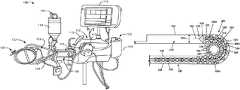 For instance, when thedrive assembly400 is driven in a first operative mode, the plurality ofmechanical segments406 can be moved so as to push thetip402 from the retractedposition416 to one or more extended positions. This can include moving thefirst segment portion406aalong the centrallongitudinal axis408 out from the drive assembly housing and into theinternal reservoir volume412. It can also include moving one or more other segment portions (e.g., the second and/orthird segment portion406b,406c) from one location that is offset from the centrallongitudinal axis408 to another location that is along the centrallongitudinal axis408. Such first operative mode may include rotatably driving theactuator404 in a first direction, such as thedirection428, and thereby moving thearm430 linearly in a first direction. Conversely, when thedrive assembly400 is driven in a second operative mode, the plurality ofmechanical segments406 can be moved so as to pull thetip402 from an extended position to the retractedposition416. This can include moving thefirst segment portion406aalong the centrallongitudinal axis408 out from theinternal reservoir volume412 and into the drive assembly housing. It can also include moving one or more other segment portions (e.g., the second and/orthird segment portion406b,406c) from one location that is along the centrallongitudinal axis308 to another location that is offset from the centrallongitudinal axis308. Such second operative mode may include rotatably driving theactuator404 in a second direction, such as opposite thedirection428, and thereby moving thearm430 linearly in a second direction.