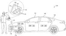 Thevehicle doors140 are slidably or pivotably attached to the vehicle. The vehicle doors provide an access from an exterior to a vehicle cabin and vice-versa. Each of the vehicle doors may include a vehicle door lock and an electronic latch (e-latch) for latching and unlatching the vehicle door lock to a frame of the vehicle (not illustrated). Each of the vehicle doors may further include at least one processor, at least one memory, at least one antenna (not illustrated). The at least one processor and the at least one antenna define anNFC reader142. It should be appreciated that the at least one processor of theNFC reader142 may be disposed in any portion within thevehicle130 and/or may be defined, at least in part, by any processor existing within thevehicle130. Each of the vehicle doors may further include a back-uppower supply144 for supplying power to thevehicle doors140 when the vehicle's main power supply (not illustrated) is depleted. It should be appreciated that the back-uppower supply144 may be located in other areas within thevehicle130. It should be further appreciated that each of thevehicle doors140 may further include one or more switches for controlling saidvehicle door140, one or more motors for automatically controlling movements of saidvehicle door140, and any additional hardware devices for operating saidvehicle door140.