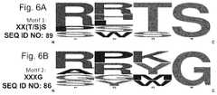 FIG. 6A andFIG. 6B depict sequence consensus of the top-12 hits from the CDR-L3 phage selection, showing strong sequence preferences. The top-12 hits showed two unique sequence motifs.FIG. 6A depictsmotif 1, having the XX(T/S)S sequence (SEQ ID NO: 89), andFIG. 6B depictsmotif 2 having the XXXG sequence (SEQ ID NO: 86) at the CDR-L3 insertions.