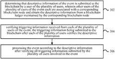 In an embodiment, the user may submit the descriptive information to other users of the event to verify the content of the descriptive information. Each user may separately submit triggering information for the event to the blockchain, so that each user may asynchronously perform a triggering operation (that is, submits the triggering information), instead of implementing triggering operations by one user in a centralized manner. Therefore, processing load can be shared to prevent a single user from taking excessively high processing load. Moreover, each user can selectively process events that the user involved in or even process events in batches according to an actual condition (such as processing load, and priority management) of the user.