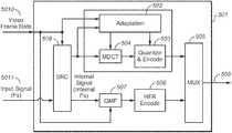 TheMDCT module504 transforms the input time domain signal of sampling rate “Internal Fs” into the frequency domain. The “Quantize & Encode”module503 quantizes the MDCT lines according to a psychoacoustic model taking into account the human auditory system's variation in sensitivity and frequency resolution as a function of actual (physical) frequency. The “Quantize and Encode”module503 can be adapted to do the quantization and psychoacoustics using the internal sampling frequency or the external sampling frequency. If the latter is selected, a deviation from the actual physical frequency will be present since the sampling rate converter is not taken into account. However, given the design of the system, this deviation is sufficiently small to make be neglected. Or put differently the psychoacoustics is apt to adapt to different ranges of sampling rates given a specific size of the MDCT, but the deviation of the internal sampling rate from the external sampling rate of the signal due to the sampling rate converter is sufficiently small to not fall outside of the range of the tuning parameters for the external sampling rates.