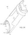 FIGS. 24 and 25 show an alternative embodiment of a suturing device shown generally at150. Referring toFIGS. 24 and 25, thesuturing device150 can be used to produce a continuous or interrupted stitch or suture so as to enable closure of openings internal to a patient's body. Thesuturing device150 can be utilized to suture any type of anatomical tissue in any type of anatomical cavity; and, accordingly, while thedevice150 is described hereinafter for use with a cannula in endoscopic procedures, such as laparoscopy, thedevice150 can be used in open surgery and with catheters and other small and large diameter tubular or hollow, cylindrical members providing access to small cavities, such as veins and arteries, as well as large cavities, such as the abdomen.