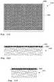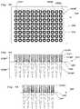 FIG. 49 shows a top perspective view of an assembly comprising a pipette tip retention sheet embodiment having circular holes and an array of pipette tips joined to the second surface of the sheet and in alignment with the holes.FIG. 50 shows an enlarged view of a portion of the assembly shown inFIG. 49.FIG. 51 shows a bottom perspective view of the assembly shown inFIG. 49 andFIG. 52 shows an enlarged view of a portion of the assembly shown inFIG. 51.FIG. 53 shows a top view of the assembly shown inFIG. 49 andFIG. 54 shows an enlarged view of a portion of the assembly shown inFIG. 53.FIG. 55 shows a bottom view of the assembly shown inFIG. 49, andFIG. 56 shows an enlarged view of a portion of the assembly shown inFIG. 55.FIG. 57 shows a long side view of the assembly shown inFIG. 49,FIG. 58 shows an enlarged view of a portion of the assembly shown inFIG. 57, andFIG. 59 shows a short side view of the assembly shown inFIG. 49.FIG. 60 shows a bottom perspective view of a variant of the assembly shown inFIG. 49, where the sheet inFIG. 60 is flexed and is curved, and where the sheet shown inFIG. 49 is not flexed and is flat or planar.FIG. 61 shows a side view of the assembly shown inFIG. 60.
