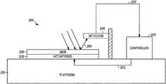 FIG. 3 shows a simplified schematic diagram of one example of amobile system200 that includes amobile platform210 on which a tunablereflective skin220 is located. One ormore actuators230 or other activated elements are located below the tunablereflective skin220 for flexing and/or stretching theskin220. Adetector240 is located on theplatform210 for receiving light260 reflected from theskin220. Asignal245 from thedetector240 which is indicative of the reflectivity of theskin220 is sent to acontroller250. Thecontroller250 may be located on theplatform210 or elsewhere on themobile system200. In response, thecontroller250 generates acontrol signal255 that is provided to theactuators230 to thereby cause the flexing and/or stretching of theskin220 and the consequent change in the optical reflectivity of theskin220.