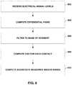 FIG. 8 is a flowchart illustrating another example operation in accordance with techniques of the disclosure. In the example,processing circuitry210 may receive electrical signal levels (e.g., voltage measurements) fromelectrodes116,118 (802). For example,memory211 may store the electrical signal levels andprocessing circuitry210 may receive the electrical signal levels frommemory211.Processing circuitry210 may compute differential pairs based on the electrical signal levels (e.g., ΔVi,i−1−ΔVi+1,iand ΔVj,j−1−ΔVj+1,j) (804).Processing circuitry210 may determine a fast Fourier transform (FFT) (or other types of transform from time-domain to frequency domain) of the CSD values for each contact (806).Processing circuitry210 may compute the CSD values in the frequency domain as described above (808).Processing circuitry210 may compute aggregate measures and/or ranks (810). An example of the aggregate measurement is the average level value (e.g., RMS value), and an example of the rank is the phase-magnitude representation, as described above. Also, the RMS value is one example, and other techniques to determine the average level value includes sum(abs(CSD(t))), sum(squared(CSD(t)), sqrt(sum(squared(CSD(t)-mean(CSD(t))))), etc. The average level value may be determined using other techniques as well.