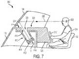 Thewindshield104 extends upward from the generally horizontalupper surface322 of thedash320 and, in this embodiment, from thecontrol console support176, to which thewindshield104 is mounted. Thewindshield104 is slanted with respect to the floor172 (or the generally horizontalupper surface322 of the dash320). In this embodiment, thewindshield104 is inclined at a non-zero angle (angle α) with respect to the floor172 (or the generally horizontalupper surface322 of the dash320). Preferably angle α is between 30 degrees and 45 degrees. As a result of the slant, thewindshield104 extends over theopening326 in thedash320. In this embodiment, the portion of thewindshield104 that extends over theopening326 in thedash320 is a generally planar surface, but it can also be curved. This curvature not only includes curvature in the inboard and outboard directions (e.g., as thewindshield104 transitions between the orientation of thewindshield104 near thecenterline102 of the boat and the orientation of thewindshield104 at thegunwales122,124), but also curvature in the fore and aft directions.