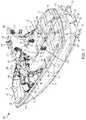 Theboat100 is also equipped with an apparatus for towing a water sports participant. As shown inFIGS. 1 and 2, the towing apparatus is atower160 that is particularly used for towing a wakeboarder. Anysuitable tower160 may be used including, for example, those described in U.S. Pat. No. 9,580,155 and U.S. patent application Ser. No. 15/628,791, which are incorporated by reference herein in their entireties. Thetower160 includes two legs: aport leg162 and astarboard leg164. Theport leg162 is attached on the port side of thecenterline102 of theboat100, and thestarboard leg164 is attached on the starboard side of thecenterline102 of theboat100. Preferably, the port andstarboard legs162,164 are attached to theport gunwale122 and to thestarboard gunwale124, respectively. Thetower160 also includes aheader166. Theheader166 is connected to an upper portion of each of the twolegs162,164 and spans theinterior130 of theboat100 at a height suitable for passengers to pass underneath while standing. In addition, thetower160 has a tow-line-attachment structure168 at an upper portion of the tower160 (theheader166 in this embodiment). This tow-line-attachment structure168 may be used to connect a tow-line suitable for towing a water sports participant, such as a wakeboarder. Any suitable tow-line-attachment structure may be used, including but not limited to the integrated light and tow-line-attachment assembly disclosed in U.S. Pat. No. 6,539,886, which is incorporated by reference herein in its entirety.
