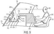 The sound waves emanating from thedash speaker218 may be reflected off of other surfaces in addition to thewindshield104 before reaching the listening position.FIG. 9 is a cross-section taken along line5-5 inFIG. 2 showing another alternativedash speaker enclosure410. In this embodiment, thedash speaker218 is mounted on one of thesidewalls414 of theenclosure410, instead of the bottom412. Here thedash speaker218 is mounted at an inclination angle β that is perpendicular to the floor. The sound waves emanating from thespeaker218 travel in the direction indicated bycenterline224. Before being reflected off of thewindshield104, the sound waves are reflected off of areflective surface418 and travel in the direction indicated bycenterline228a. In this embodiment, thereflective surface418 is an inner surface of one of thesidewalls414 of the enclosure theenclosure410. After being reflected off of thereflective surface418, the sound waves travel through theopenings326,416 in both theenclosure410 and thedash320, and are then reflected off of thewindshield104 aft toward a listening position (in the direction indicated bycenterline228b). The angle (angle γ) of thereflective surface418 is coordinated with the angle of the dash speaker218 (angle β) and the angle of the windshield104 (angle α) to direct the reflectedsound waves226 to the desired listening position. In this embodiment, the angle (angle γ) of thereflective surface418 is at a non-zero angle with respect to thefloor172.