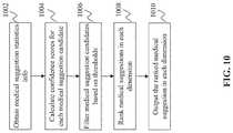 The statistic measures and/or the confidence scores are sent to thecandidate filtering unit906 in this embodiment. It is understood that the total number of candidate medical suggestions in each dimension may be very large. Thus, candidate medical suggestions may be filtered in each dimension by comparing one or more statistic measures and/or the confidence score withthresholds910. In one example, if the total occurrence of a medical suggestion in the existing medical suggestion data is less than a predefined threshold, then the medical suggestion is excluded from future consideration. In another example, the confidence score of a medical suggestion is compared with a threshold to determine whether the medical suggestion should be kept. Nevertheless, the remaining candidate medical suggestions are ranked by the medicalsuggestion ranking unit908 based on their confidence scores and the rankingmodels318. In some embodiments, a predefined number of entries in each dimension is used to further filter the ranked candidate medical suggestions. For example, after ranking, only the top 1,000 drugs in each dimension are kept for future use.