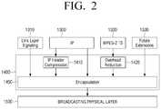 Referring toFIG. 2, the input of thebroadcasting link layer1400 includes theIP packet1300, and may further include link layer signaling1310, an MPEG2-TS packet1320, and otherpacketized data1330.