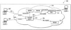 The client (206) may submit requests for content and/or service to the resolved address (10.2.2.1). Based on the anycast methodology described above, a server associated with the selected route (e.g., theroute226 to the closes server216) serves the requested content. It will be appreciated by those skilled in the art that although DNS address resolution is described above, other IP distribution/resolution methodologies may be utilized, such as, e.g., provision of a server name list during client authentication with the network.