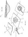FIGS. 38A-I illustrate embodiments of a negativepressure treatment system3801 which comprise a bayonet connection between aring3803 and aport3805. Theport3805 has one ormore tabs3807 which mate into acorresponding recess3808 located on thering3803, which in some embodiments may have a diameter of approximately 35 mm. Thering3803 also includes a groove (not illustrated) adjoining therecess3808 and configured to receive the tab(s)3807 and thus create a fluid-tight connection. Thering3803 preferably comprises an adhesive layer disposed on its underside (optionally protected by a release layer3811), which may be used to secure it to a drape. In an alternative embodiment, thering3803 may be adhered or welded to a smaller drape, optionally provided with a further adhesive layer. Theport3805 has aconnector3809 configured to connect to atube3804. In use, thering3803 is placed and preferably adhered over anincision3812 made on adrape3813 placed over a wound. Subsequently, theport3805 is positioned over thering3803 so that thetab3807 may fit into therecess3808. Once so positioned, the port is rotated, for example by from 30 to 90.degree., so that thetab3807 slides into the groove adjoining therecess3808 so as to create a fluidic seal. The user may therefore choose the orientation in which thetube connector3809 points irrespective of the orientation of thering3803.