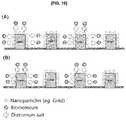 FIG. 10 is a schematic view representing immobilization of biomolecules on IDA nanoelectrodes modified with metal nanoparticles, wherein (A) both electrodes are coated with nanoparticles, and (B) only one electrode (comb) is coated with nanoparticles.