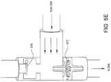 FIG. 5D is a plan view of an example of a pressure-operated valve under a first pressure condition according to some embodiments of the present disclosure. As shown inFIG. 5D, pressure-operatedvalve570 is connected totubing252,tubing258, andtubing256. In various embodiments, pressure-operatedvalve570 includes one or more check valves. In various embodiments, pressure-operatedvalve570 may include a check valve positioned within the valve inlet fromtubing252. As shown inFIG. 5D, pressure-operatedvalve570 may include a check valve positioned within the valve inlet fromtubing252 and a check valve within the valve outlet totubing258. In the illustrated example, pressure-operatedvalve570 includes a normally openswing check valve576 within the valve inlet fromtubing252 and a normally opendisc check valve577 within the valve outlet totubing258. Any suitable check valve may be utilized ascheck valve576 andcheck valve577. As illustrated inFIG. 5D, during normal operation, second IV fluid pressure fromreservoir pump260 and viatubing256 is minimal; thus, first IV fluid gravity-fed from upstream first IV fluid source (e.g. IV fluid bag210) viatubing252 is passed through pressure-operatedvalve570 and intodownstream tubing258. In various embodiments, pressure-operatedvalve570 includes a check valve (not shown) positioned within the valve inlet fromtubing256. In various embodiments, fluid pressure from below check valve577 (e.g. back flow from tubing258) will operate the disc to shutcheck valve577 and prevent any flow of fluid fromtubing258 from entering pressure-operatedvalve570.