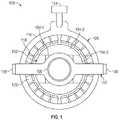 Returning now toFIGS. 1-4, thestructure106 is coupled to thespherical armature102 and extends therefrom along the first axis of symmetry508-1. Thestructure106 may be variously configured, but in the depicted embodiment it includes aflange portion111 and asleeve portion113. Theflange portion111 is disposed within thecavity506, and thesleeve portion113 extends from theopening507 in thespherical armature102 and is disposed within anopening130 formed in thebracket112. A bearing115 surrounds thesleeve portion113 and is disposed within theopening130. Thebearing115 engages thestructure106 and thebracket112, thus allowing thespherical armature102 andstructure106 to rotate together, relative to thebracket112 and thestator108, about the first axis of symmetry508-1.