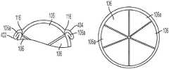 Each of the one ormore leaflets106 further includes one ormore overlap components106g(FIG. 32). These overlapcomponents106g(also described as a second component or a gill component) are similarly attached to the support structure (e.g., along anattachment zone142gat a perimeter of theoverlap component106g). Theoverlap components106gare optionally formed of similar materials to theleaflets106 or different materials as desired. In various examples, theoverlap components106gare able to slide over theleaflets106 during diametric expansion while still remaining in operable engagement with theleaflets106 when thevalve structure104 is closed, thus facilitating adjustment of thevalve structure104 to diametric expansion of theprosthetic valve100. In general terms, the width of the overlap region between theoverlap components106gand theleaflets106 is reduced as the inner diameter of theprosthetic valve100 is increased.