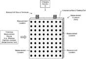 With specific reference toFIG. 5, in one exemplary implementation, an array of measurements may be taken on a grid of points (for example, fixed points with a particular spacing (for example, 5 mm spacing) on the external surface of the battery; notably, the configuration/arrangement of measurement points as an array is exemplary, any configuration/arrangement may be employed). It may be advantageous to define the measurement locations in order to ensure that cell thickness measurements are made consistently at the same points along the surface. In this implementation, thickness measurements at each measurement location are recorded in a specified order (for example, each row from left to right starting with the row closest to one of the electrode tabs). In one implementation, the point on the external surface of the battery representing the maximum thickness may be used to calculate swelling—for example, as a percentage of original thickness at the present cycle relative to the very first cycle. The location of the maximum thickness of the cell may vary from cycle to cycle since swelling may exhibit a non-uniform pattern in which case, the measurement location of maximum swelling may change. The array of measurements may be employed, via control and processing circuitry, to construct surface plots of the cell which track the evolution in cell thickness with cycling and pinpoint areas of the cell where the largest amount of swelling takes place.