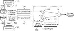 Iterations to determine the optimal contrast may occur in small steps or large steps. For a contrast enhancement that must occur in substantially real time, the system may start with coarse, large steps and then decrease the size of the steps. This may occur, for example, through a feedback loop that actively adjusts weight based on a metric, e.g., a contrast metric or a sharpness metric. For example, when working with right- and left-circularly polarized images, prior art methods include subtracting one from the other. For example, the two images with different polarizations would be subtracted from each other to highlight the differences between them. However, subtraction increases the noise. Weighted summing is a way of making noise less of a factor.