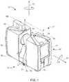 The pair ofyokes54,56 cooperate to circumscribe a convex space within which the twoshells50,52 are arranged. In the exemplary embodiment, theyokes54,56 cooperate to cover all of the outer edges of theshells50,54, while the top and bottom arm portions project over at least a portion of the top and bottom edges of theshells50,52. This provides advantages in protecting theshells50,52 and the measuringhead22 from damage during transportation and operation. In other embodiments, theyokes54,56 may include additional features, such as handles to facilitate the carrying of thelaser scanner20 or attachment points for accessories for example.