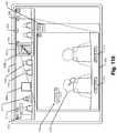 Referring again toFIG. 110, in addition to objects that include display screens, other objects that may be recognizable by a system server in theribbon view1900 may include conferees that are represented inFIG. 110 in phantom, two of which are labeled2104 and2106. In at least some cases the server may simply be programmed to generally recognize human beings in the view and, when one of the humans is selected via the interface ofFIG. 110, an enlarged view of the selected person may be presented in a fashion similar to that shown at1902 inFIG. 110. In other cases where a server monitors locations of specific persons within the local space shown inFIG. 109, the server may also track personal identities of specific employees presented in the ribbon view. Where personal identities of conferees in the ribbon view are tracked, some type of identifying information may be presented within the ribbon view for each tracked conferee either persistently, for a short duration (e.g., 3 seconds) when the ribbon view is first accessed, for a short duration when the ribbon view is selected or for a short duration when a specific conferee within the ribbon view is selected. For instance, see the exemplary identifyingfield2110 shown inFIG. 110. Identifying fields may also be presented in theenlarged view field1902 as shown at2112 and2114.Fields2110,2112 and2114 are exemplary augmented reality fields for presenting additional information about objects (e.g., conferees) within the video content.