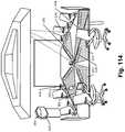 In at least some embodiments it is contemplated that some additional type of FOV indicator may be provided within a conference space to indicate remote user FOVs within the space to the local conferees. For instance, referring again toFIGS. 109 and 110, where a remote user's FOV presented infield1902 corresponds to theFOV2230 in the local space shown, the system in the local conference space may dynamically indicate the FOV in the local conference space in some fashion. For example, a laser writer device2232 may be provided on top of thecamera1880 that can be controlled to generate a laser outline as shown at2230 to indicate the current remote user's FOV. Here, as the remote user changes her FOV, the laser writer would move theoutline2230 to a different location within the 360FOV1890 that mirrors the remote user's FOV.