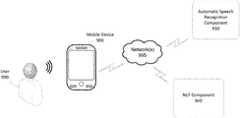 ASR component930 may be configured to process received audio input (e.g., audio input representing the acoustic input) to form a textual representation of the audio input (e.g., a textual representation of the constituent words in the acoustic input that can be further processed to understand the meaning of the constituent words). Such processing to produce a textual representation may be performed in any suitable way. In some embodiments,ASR component930 may convert speech to a representation other than a textual representation, or the speech may not be recognized as words, but instead a sequence or collection of abstract concepts. It should be appreciated that the words and/or concepts represented in the acoustic input may be represented and/or stored as data in any suitable form, as aspects are not limited in this respect.ASR component930 may transmit the recognized acoustic input over the network to be received by the mobile device and/orASR component930 may provide the recognized acoustic input toNLP component940 to assist in understanding the semantic content of the acoustic input to evaluate whether the acoustic input includes a voice command. According to some embodiments,ASR component930 may be configured to perform limited vocabulary recognition and/or generally unrestricted recognition using one or any combination of suitable acoustic models, vocabularies/lexicons, grammars, language models, etc. to perform recognition, as aspects are not limited for use with any particular ASR implementation. Any of the ASR processing stages described herein may be performed byASR component930.