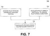 FIG. 7 is an example process, or method,700 for calculating a physiological factor score. Various data regarding fitness variables of the pilot is collected and used to calculate the physiological factor score. Collected data can include assessing the pilot's fitness variables throughtesting702, such a through use of a therapy device, and an evaluation of the pilot's spinal condition using anassessment protocol704. The collected data can then be used to calculate a physiological factor score for thepilot706. The calculated physiological factor score can be a single value or can be a set of values, with each value corresponding to a specific fitness variable.