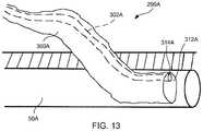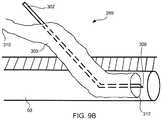 Referring toFIG. 9A, an exemplaryexpandable access device299 may include a substantially collapsedconduit300 affixed to a substantiallyrigid guide302, such as a guide wire, a stylet, and/or a needle for any other penetrating device), which may include adistal end308. In some exemplary embodiments, guide302 may include solid and/or hollow portions. Aproximal end310 of theconduit300 may be configured to couple with a sensor, monitoring system, vacuum, and/or supply for air, water, sterile fluid, disinfectant, and/or a therapeutic substance. Exemplary therapeutic substances may include antibiotics, hydroxypatite, anti-inflammatory agents, steroids, antibiotics, analgesic agents, chemotherapeutic agents, bone morphogenetic protein (BMP), demineralized bone matrix, collagen, growth factors, autogenetic bone marrow, progenitor cells, calcium sulfate, immo suppressants, fibrin, osteoinductive materials, apatite compositions, germicides, fetal cells, stem cells, enzymes, proteins, hormones, cell therapy substances, gene therapy substances, and/or combinations thereof. In an exemplary embodiment,conduit300 may be tightly configured aroundguide302 during insertion of theaccess device299 into abody structure50, such as a vein, an artery, etc.