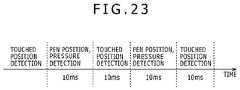 On the other hand, if two kinds of pointers including a finger and a pen are detected at the same time by theposition detection circuit230, then by switching the function of theposition detector210 time-divisionally between the touch panel function and the tablet function as illustrated inFIG. 23, it is possible to create a state wherein operations of a finger and a pen appear to be detected at the same time. It is also possible to switch the function setting such that, where a pen and a finger are detected at the same time, the position detector enters the mode for detecting one of the pen and the finger (touch panel function or tablet function).