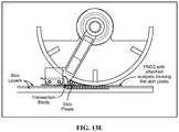 FIG. 13E is a side view of the drum dermatome with the transection blade clip showing transection of skin pixels by the blade clip, under an embodiment.